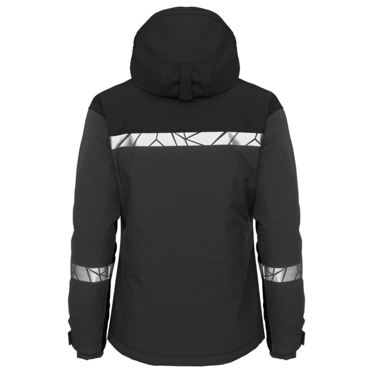 ProJob Fôret Softshelljakke Dame – varm og væravvisende damejakke med fleecefôrede lommer, ID-kortholder og avtagbar hette. Kan leveres med logo. Sertifiseringer: ISO 15797, EN 17353, Øko-Tex 100.
