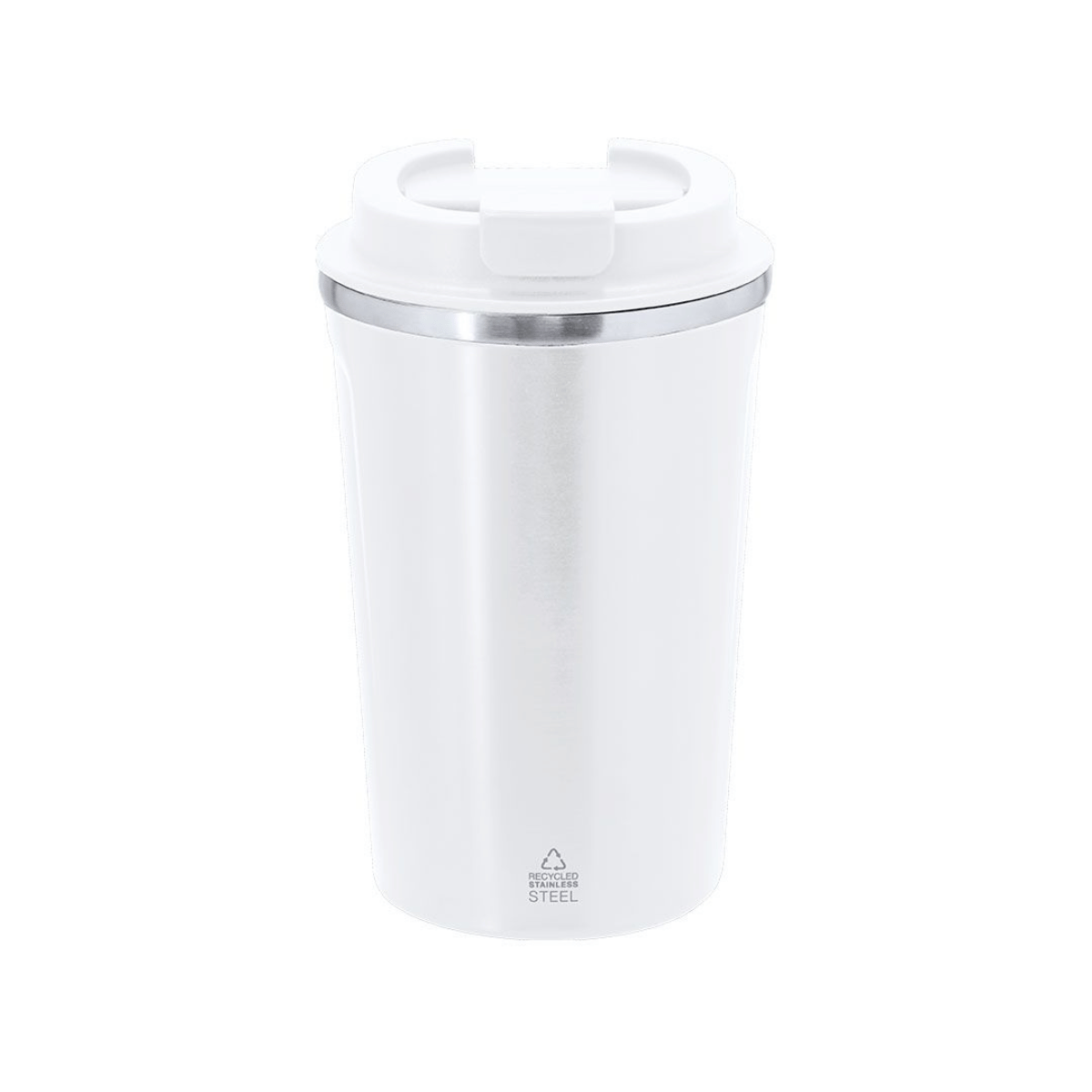 Dobbeltvegget termokopp i resirkulert rustfritt stål med BPA-fritt lokk og enkel åpne-/lukkefunksjon. Kapasitet 400 ml. Kan leveres med trykk eller gravering av din logo/design – perfekt som firmagave eller profilprodukt.