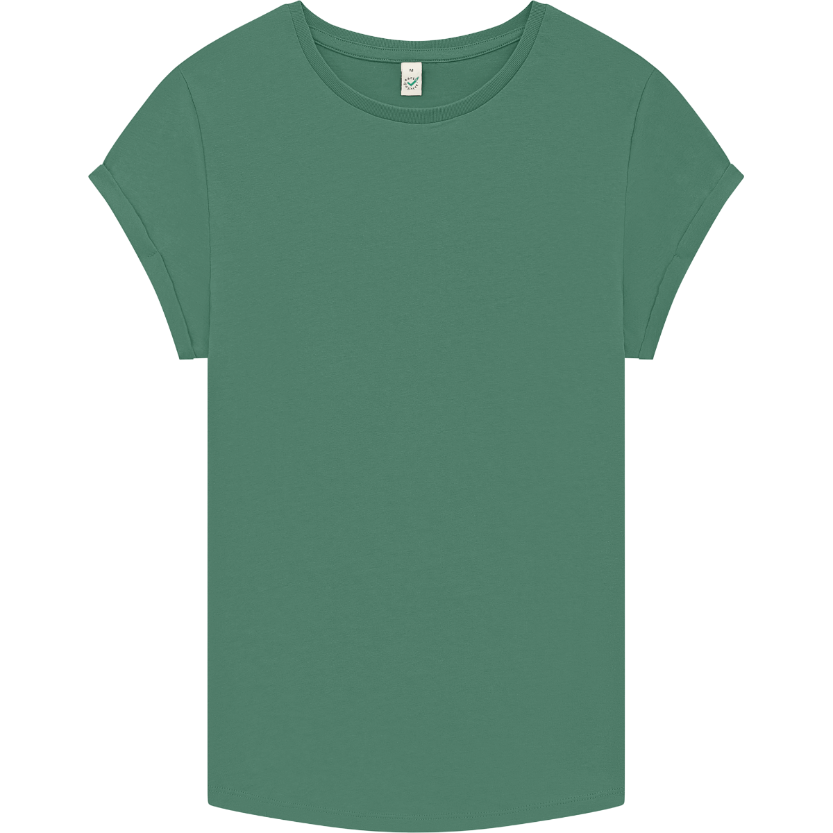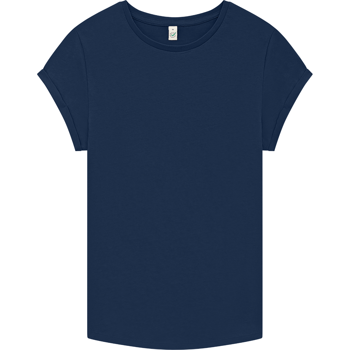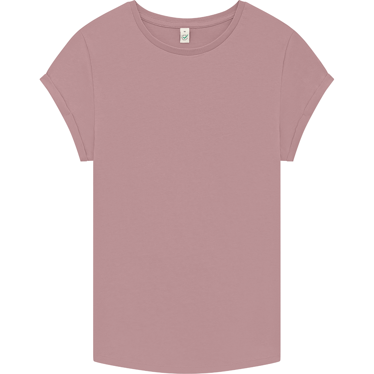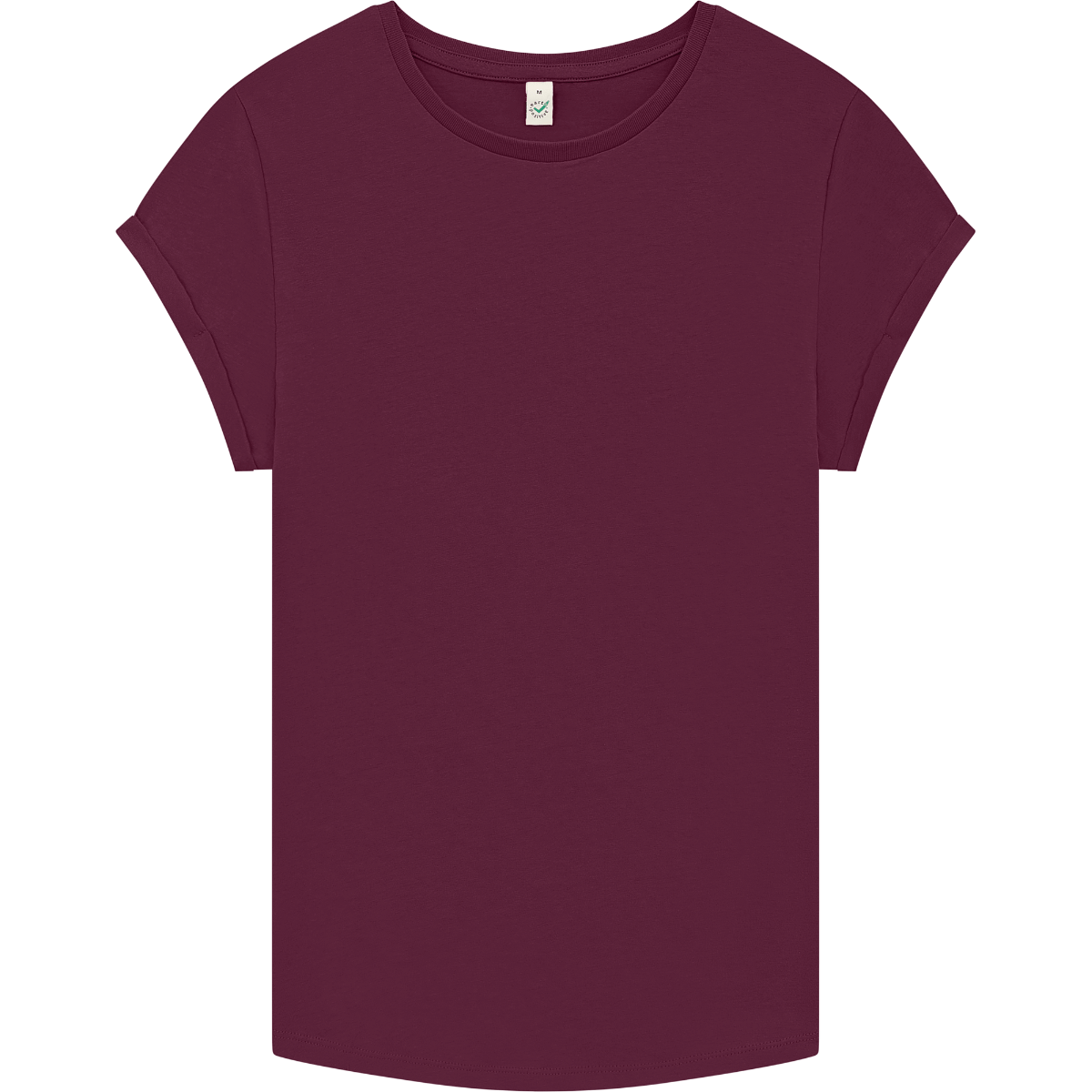 Feminin T-skjorte i 100 % økologisk bomull med oppbrettede ermer og moderne passform. Myk, lett og bærekraftig produsert – sertifisert etter GOTS, Fair Wear og Oeko-Tex Standard 100. Kan leveres med kundens logo i flere trykkmetoder som transfer, silketrykk og brodering.