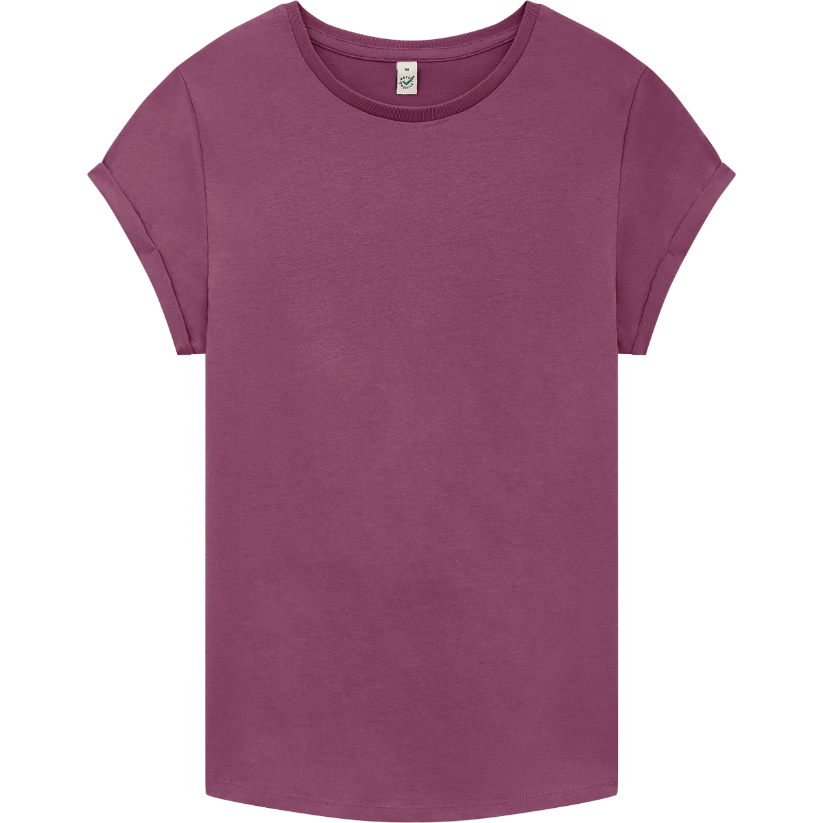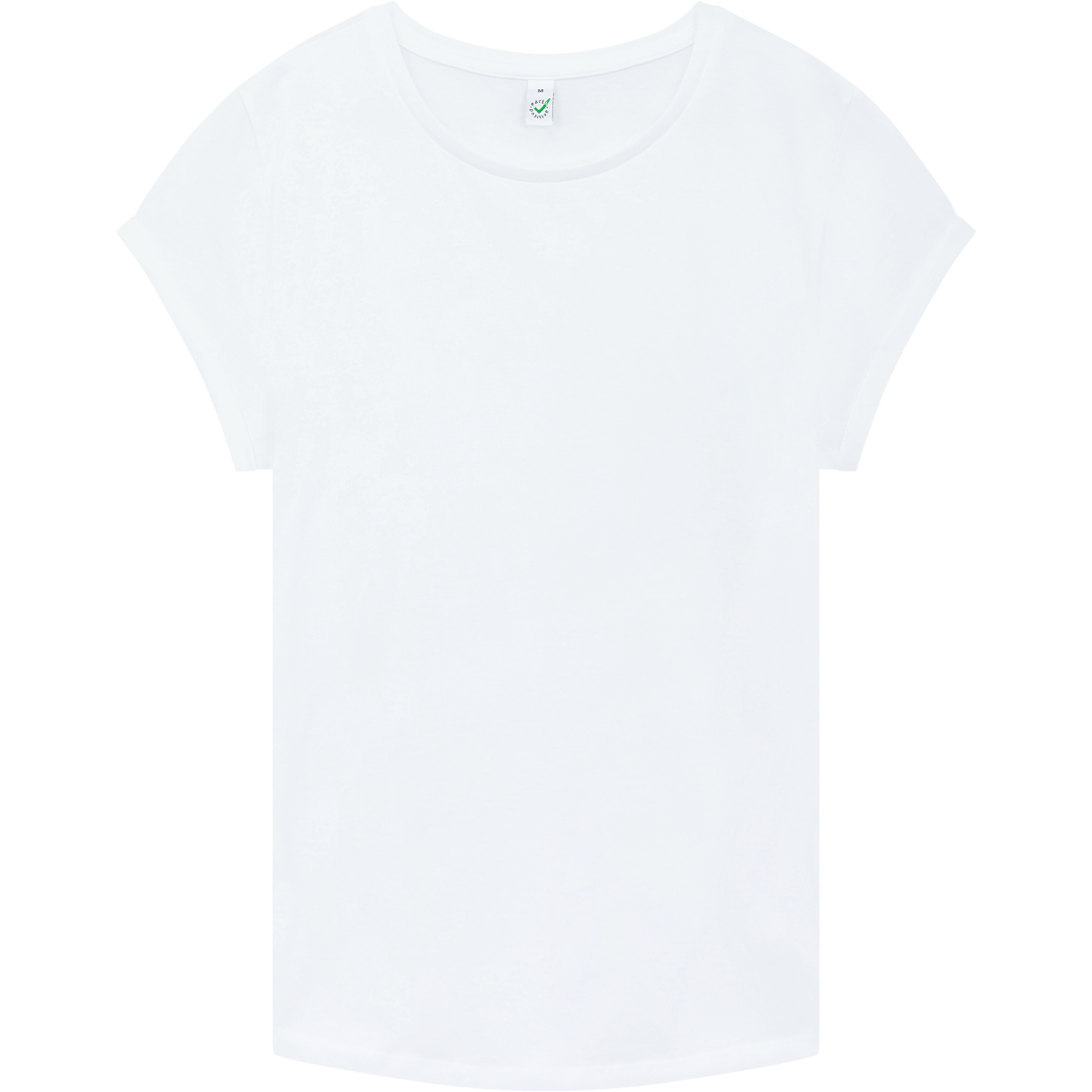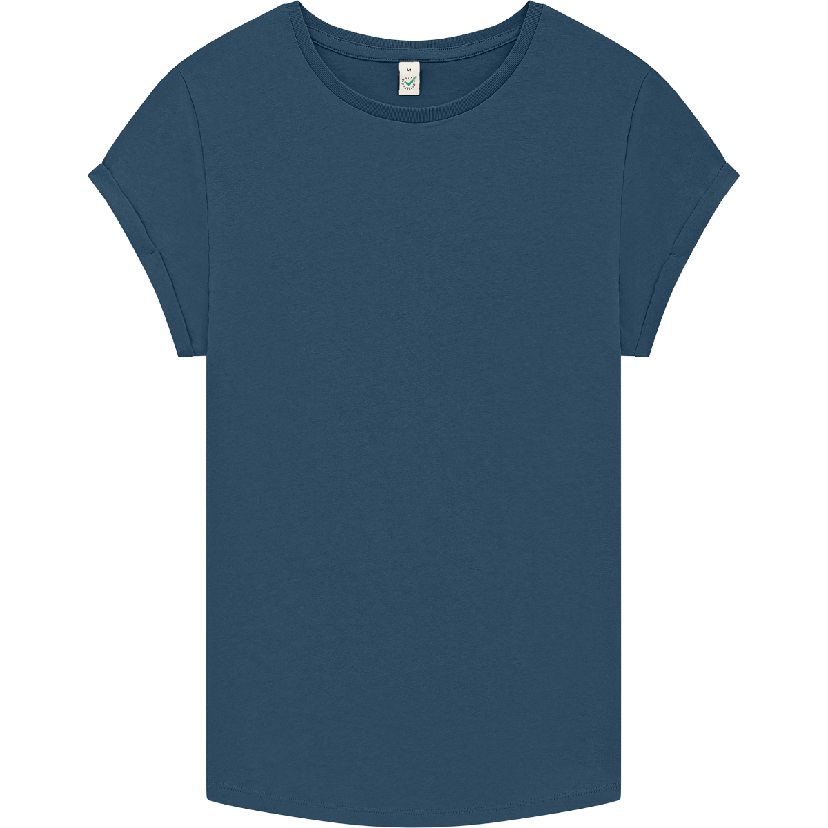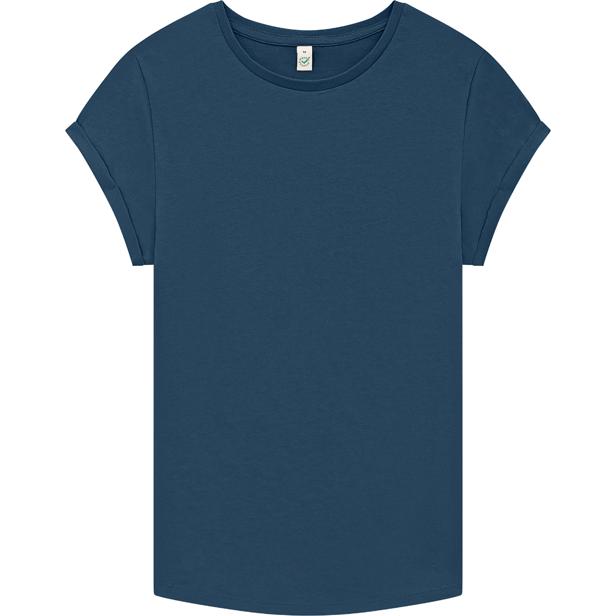 Feminin T-skjorte i 100 % økologisk bomull med oppbrettede ermer og moderne passform. Myk, lett og bærekraftig produsert – sertifisert etter GOTS, Fair Wear og Oeko-Tex Standard 100. Kan leveres med kundens logo i flere trykkmetoder som transfer, silketrykk og brodering.