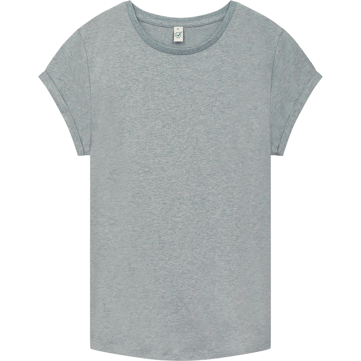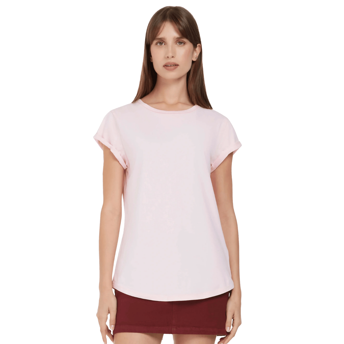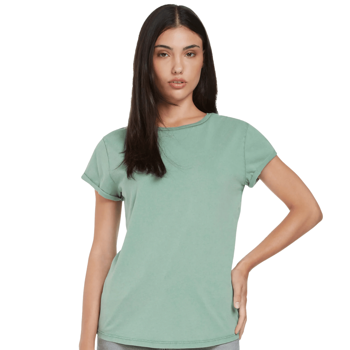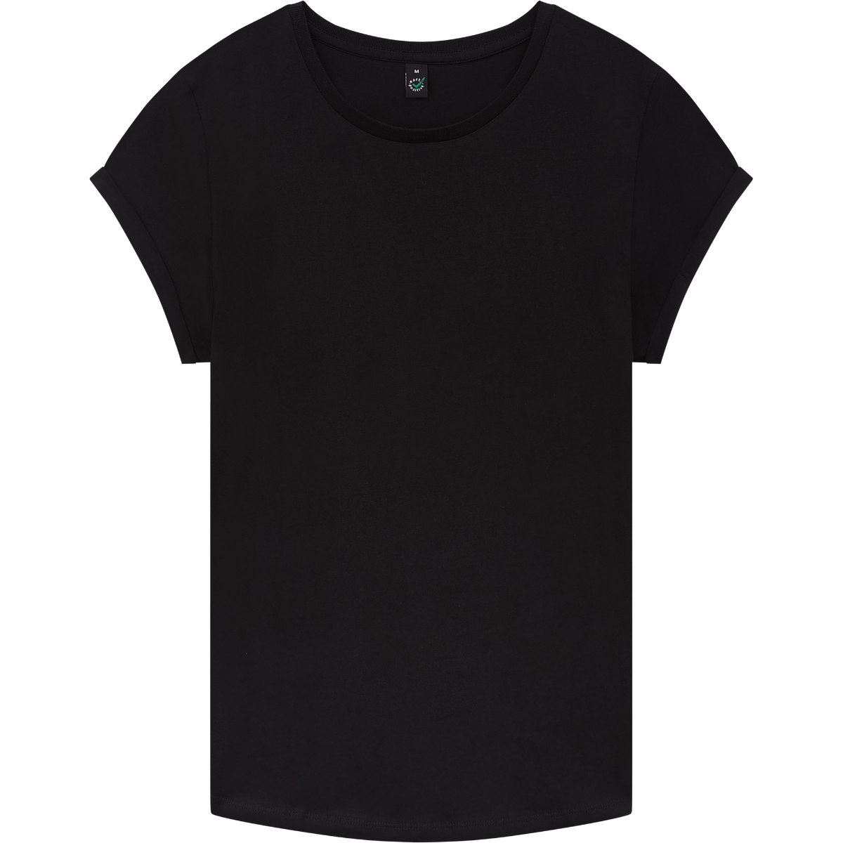 Feminin T-skjorte i 100 % økologisk bomull med oppbrettede ermer og moderne passform. Myk, lett og bærekraftig produsert – sertifisert etter GOTS, Fair Wear og Oeko-Tex Standard 100. Kan leveres med kundens logo i flere trykkmetoder som transfer, silketrykk og brodering.