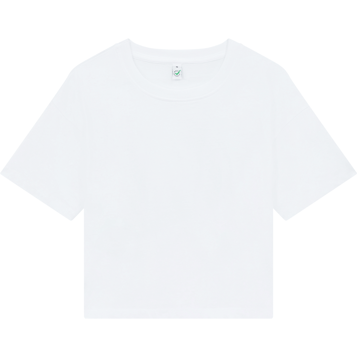 Kort, boxy T-skjorte i 100 % økologisk bomull (185 g/m²) med moderne snitt og premium kvalitet. Bærekraftig produsert og sertifisert etter GOTS, Fair Wear og Oeko-Tex Standard 100. Kan leveres med kundens logo i transfer, silketrykk eller brodering.